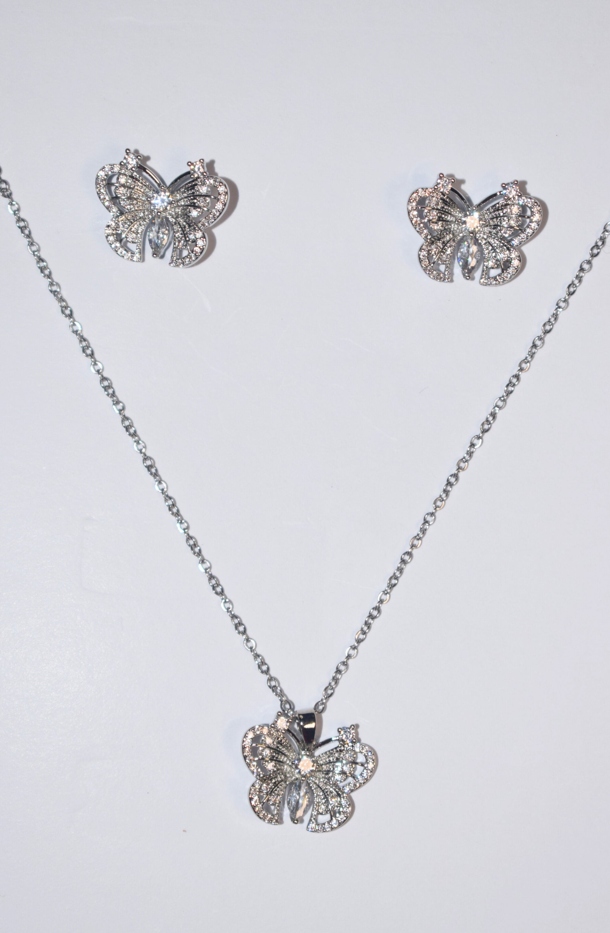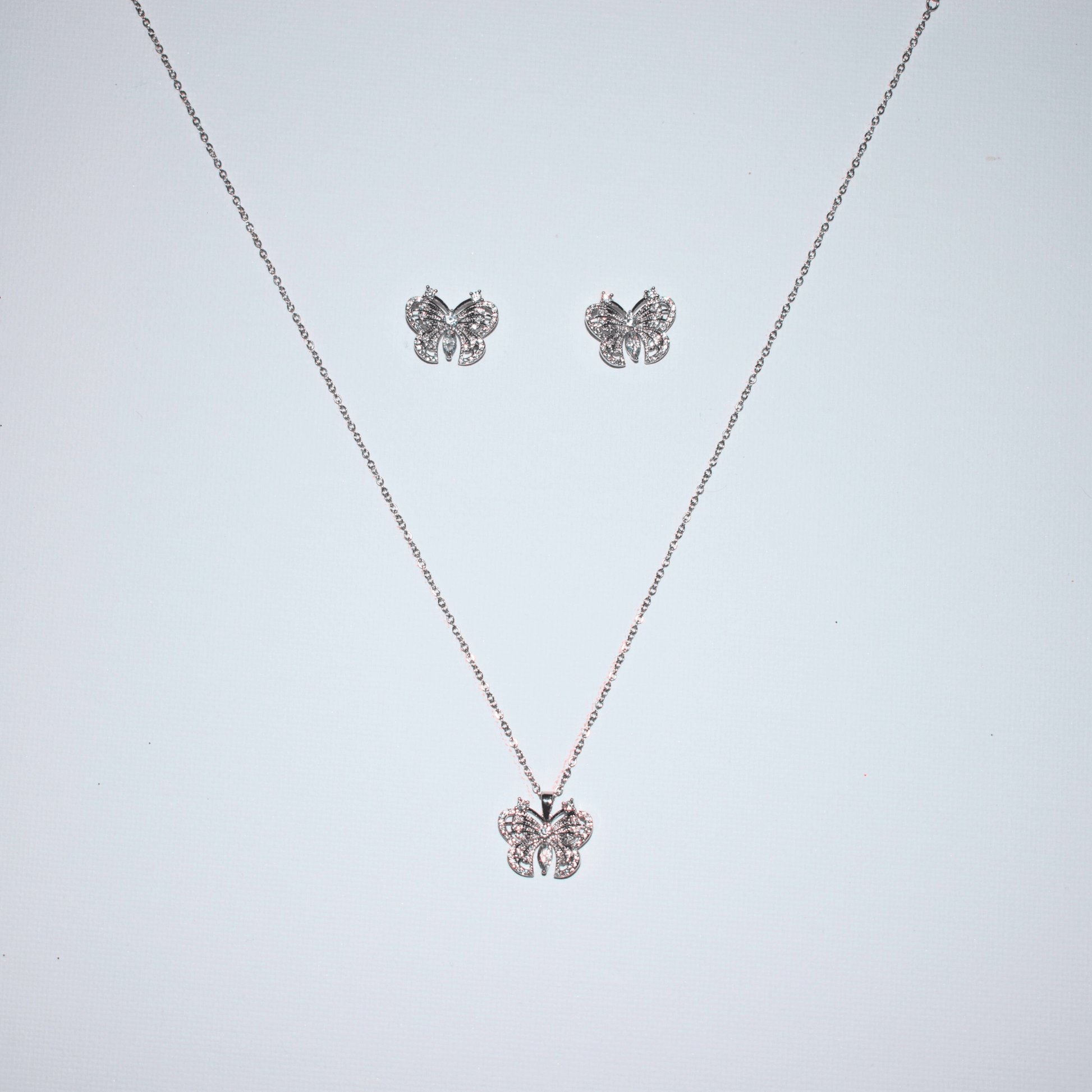 A delicate butterfly charm necklace paired with matching earrings — a graceful duo that speaks of elegance and quiet charm. This silver-toned set catches the light beautifully, making it the perfect companion for day-to-night styling.